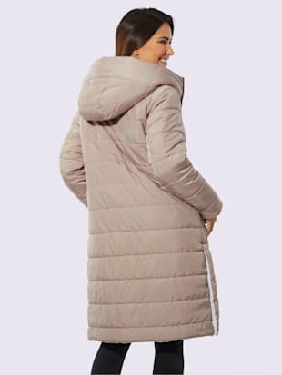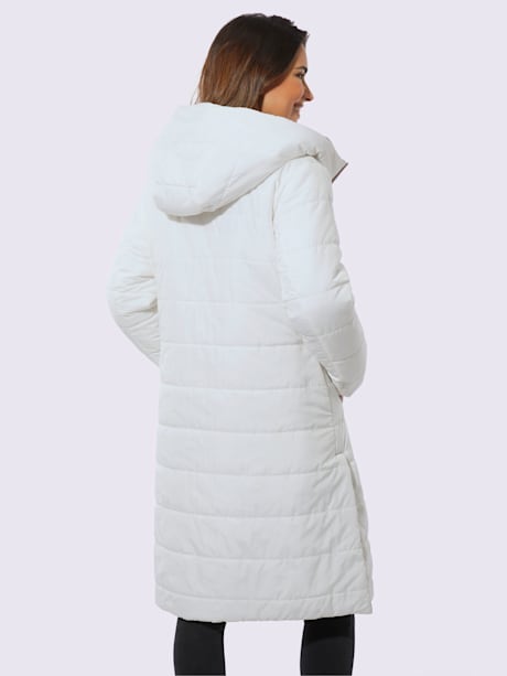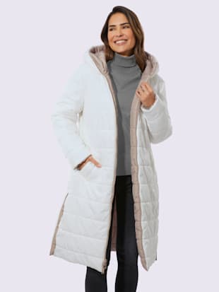 À porter de 2 manières ! Manteau réversible à capuche, à porter avec le côté sombre ou clair à l'extérieur. Motif piqué horizontal, pinces poitrine et 2 poches des deux côtés. Fentes latérales réglables à l'aide de boutons-pression. Doublure et garnissage pour un effet de chaleur garanti.